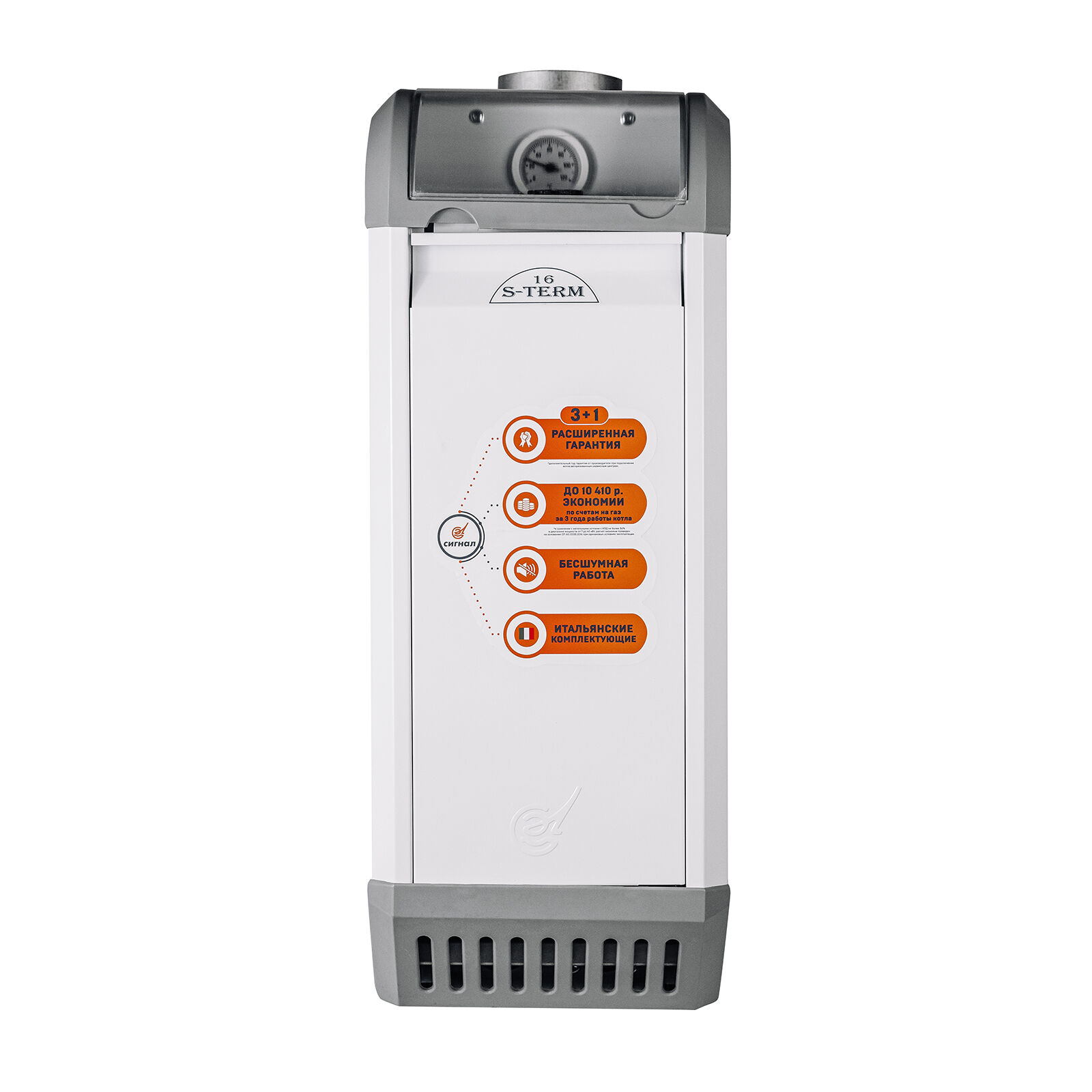 Энергонезависимые напольные газовые котлы отопления «S-term» обладают высоким КПД – свыше 90%, и мощностью – от 7 до 25 кВт. Это производительное, безопасное и прочное оборудование со сроком службы до 15 лет. Компактные и удобные в использовании напольные газовые котлы «S-term» оснащены инжекционной низкофакельной горелкой из высоколегированной коррозийно-стойкой стали, автоматической системой безопасности и датчиками для надежной и стабильной работы: контроля температур, пламени и тяги.